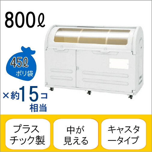仕様 商品名 ステーションボックス(透明窓タイプ)#800C キャスター仕様 容量 約800リットル 製品重量 47kg サイズ 156cm(幅) x 76.8cm(奥行) x 112cm(高さ) 材質 本体:ポリエチレン(PE) 透明窓:ポリカーボネート キャスター:ゴム(φ75mm) カラー ウォームグレー 脚タイプ Cタイプ:キャスター仕様 ※掃除や運搬をするときに移動が便利なキャスタータイプです。